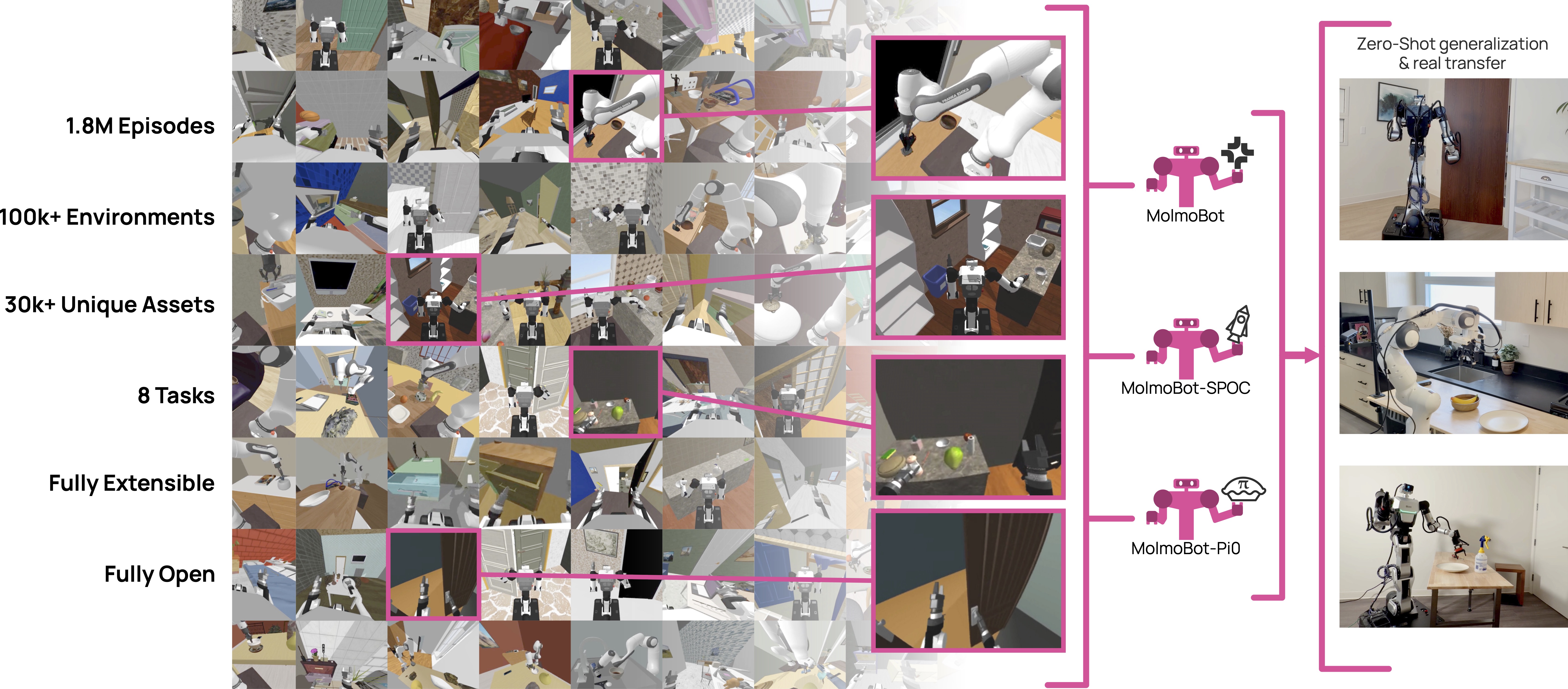 MolmoSpaces is a fully open embodied AI platform featuring diverse indoor scenes,